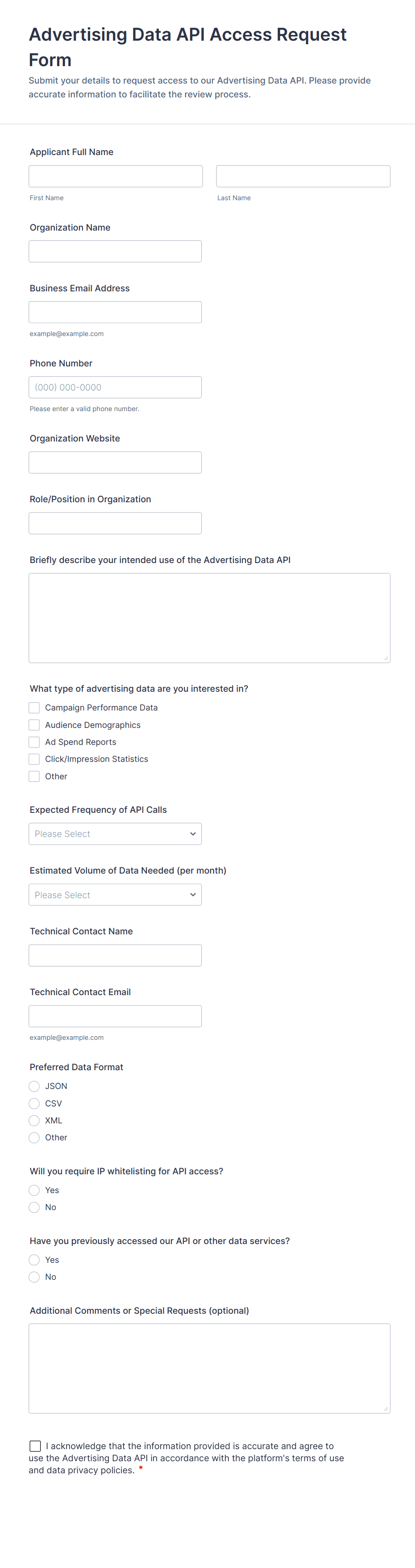 Include required checkboxes confirming the requester understands access policies and responsibilities.