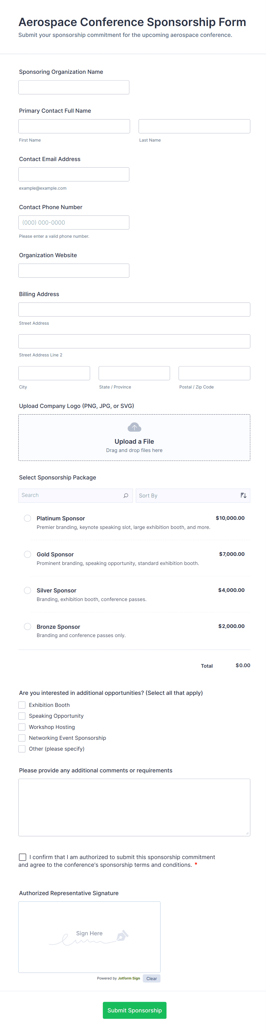 Typical fields include sponsor name, contact details, organization, sponsorship level or package, contribution amount, payment method, recognition preferences, and agreement to terms.