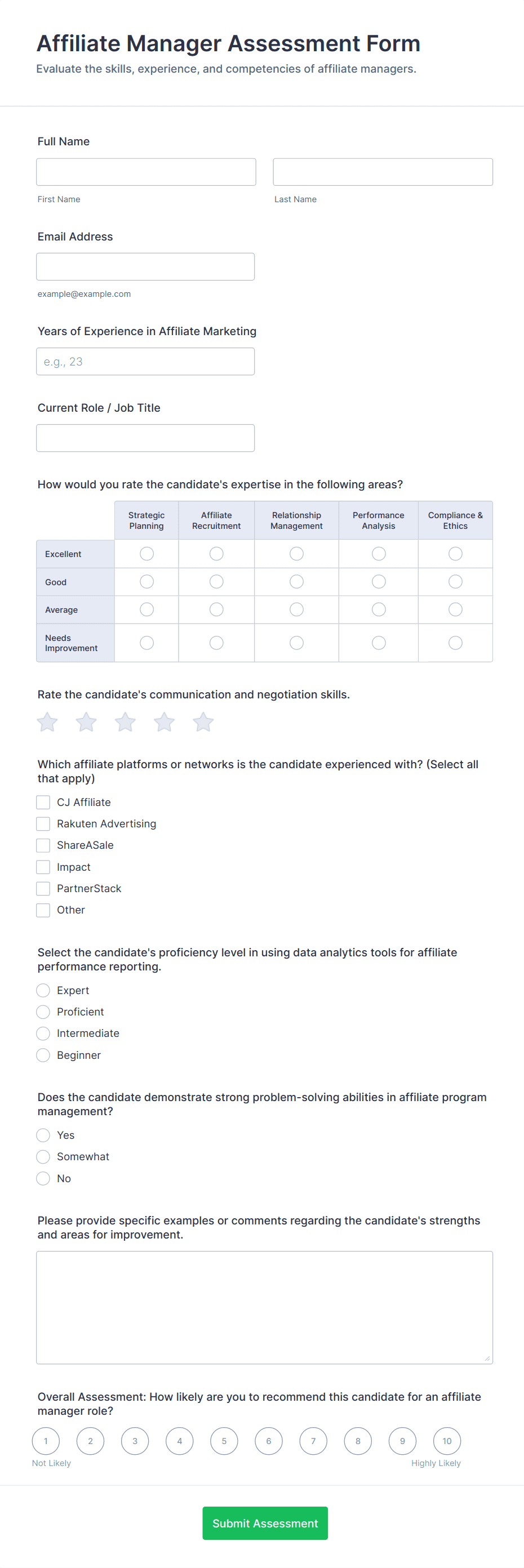 Assessment forms may include personal details, multiple-choice or open-ended questions, rating scales, comment sections, and sometimes automated scoring or feedback fields, depending on the purpose.