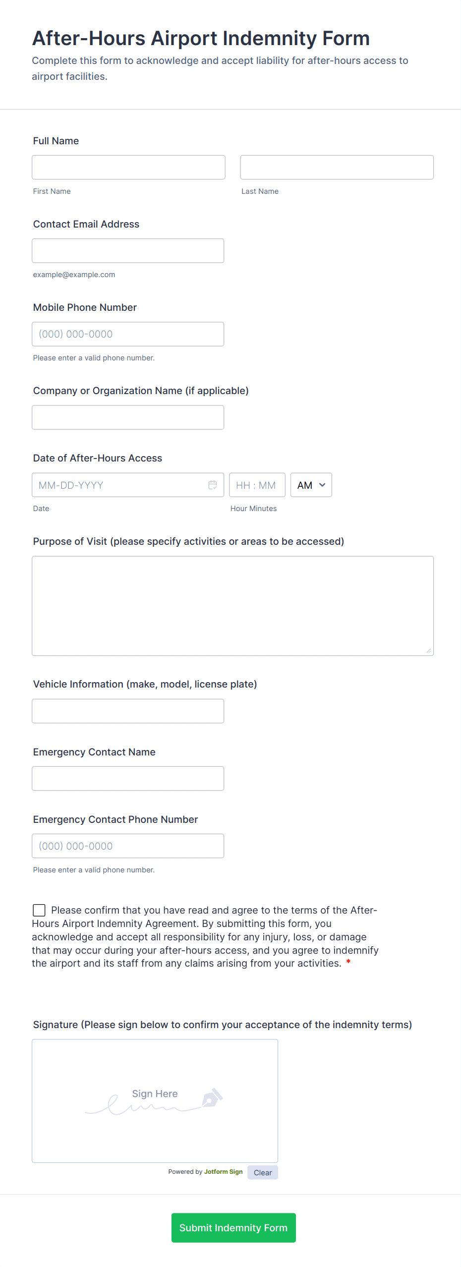 The form templates here are for informational purposes only. Jotform is not providing legal, financial, or other advice, or implying that the forms are legally valid in all or any jurisdictions. Before using any such form, consult an attorney and/or other applicable professionals to make sure that the form meets your needs, legally and otherwise.