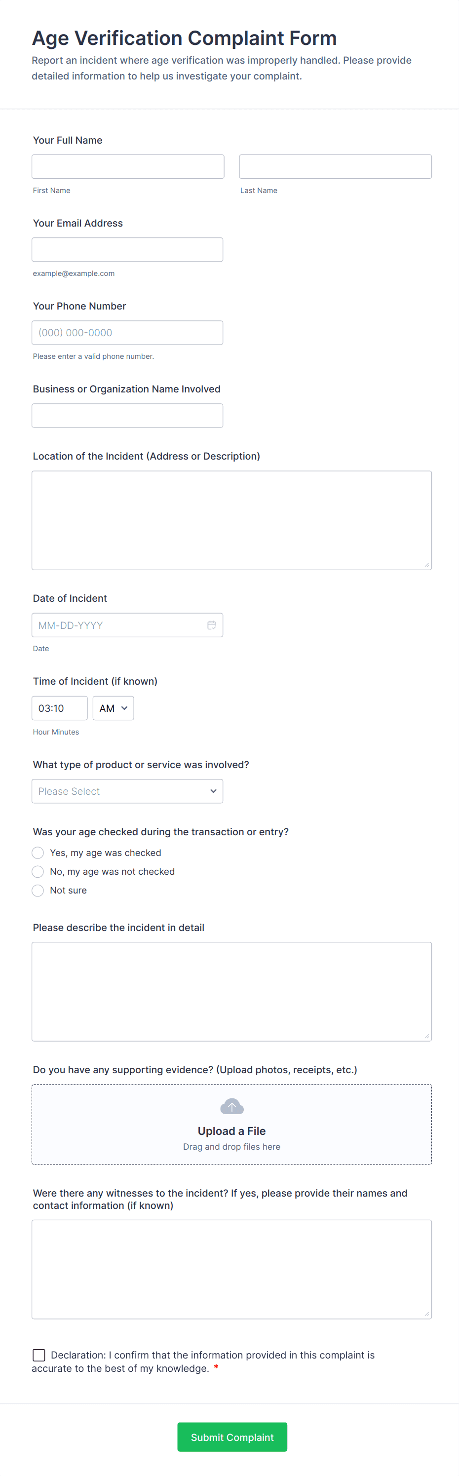 • Conditional Logic: Certain fields may appear only if specific options are selected (e.g., type of complaint).