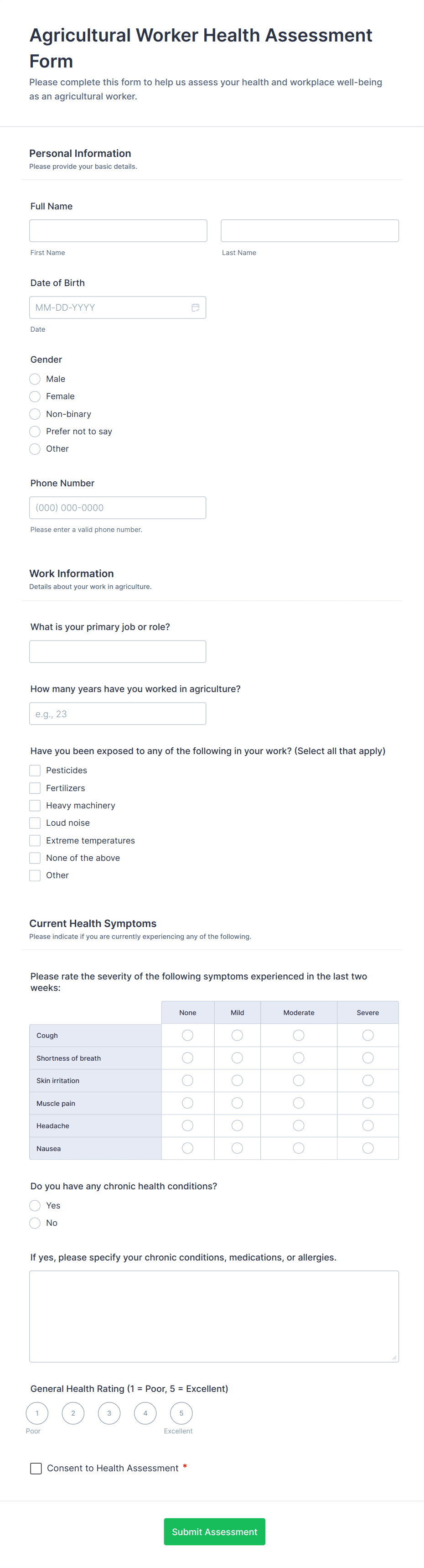 Add fields for symptoms, medical history, medications, allergies, lifestyle factors, and functional status depending on the assessment type. Use rating scales for severity and impact.