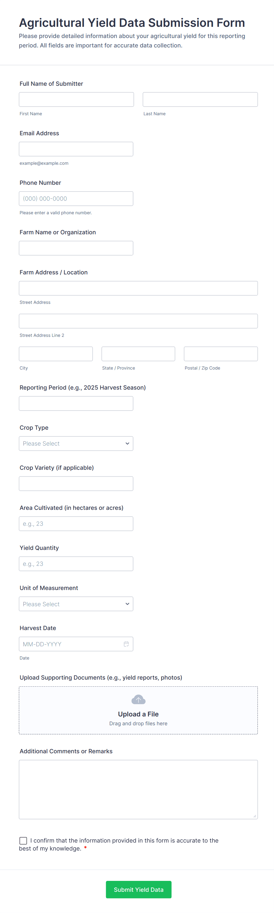 Collect and manage information for your farm with free online Farmer Forms. Whether you’re filling out land lease agreements, selling your products, or collecting worker applications, choose a template below and customize it to perfectly match your needs with our drag-and-drop builder. No coding required! You can then embed your form in your website, share it with a link, or fill it out yourself directly from your smartphone, tablet, or computer. Stop tracking information with pen and paper and upgrade to online Farmer Forms that work great on any device.