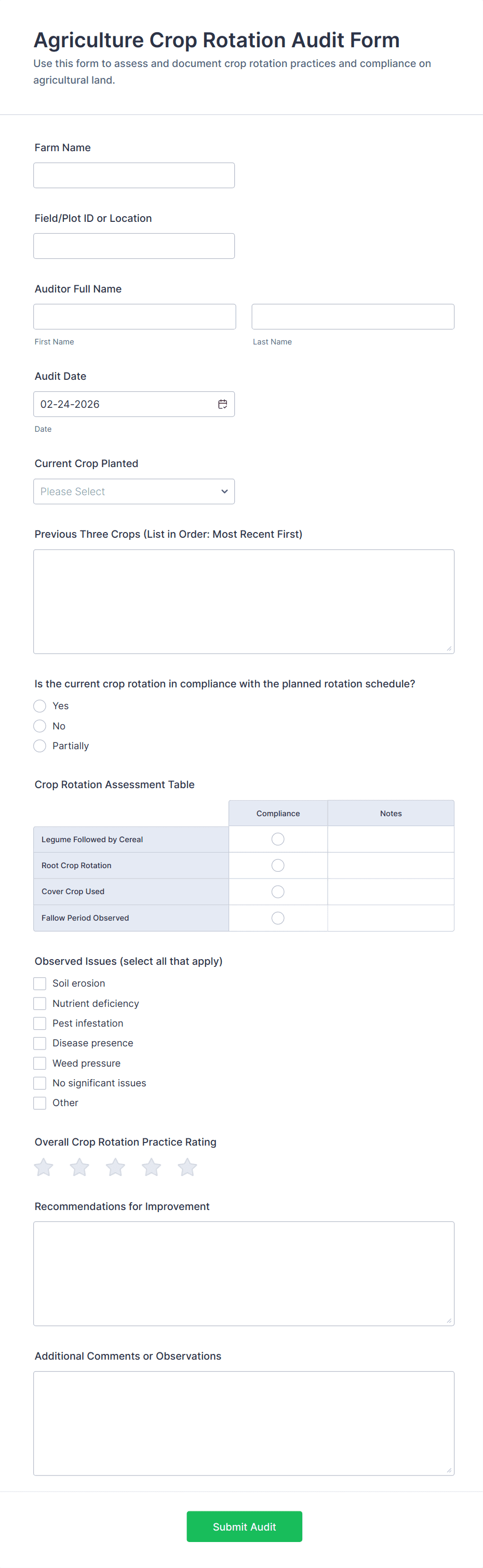 Farm Evaluation Form helps farm managers, consultants, and field teams standardize evaluation notes and scoring for consistent data collection across sites and seasons using Jotform.