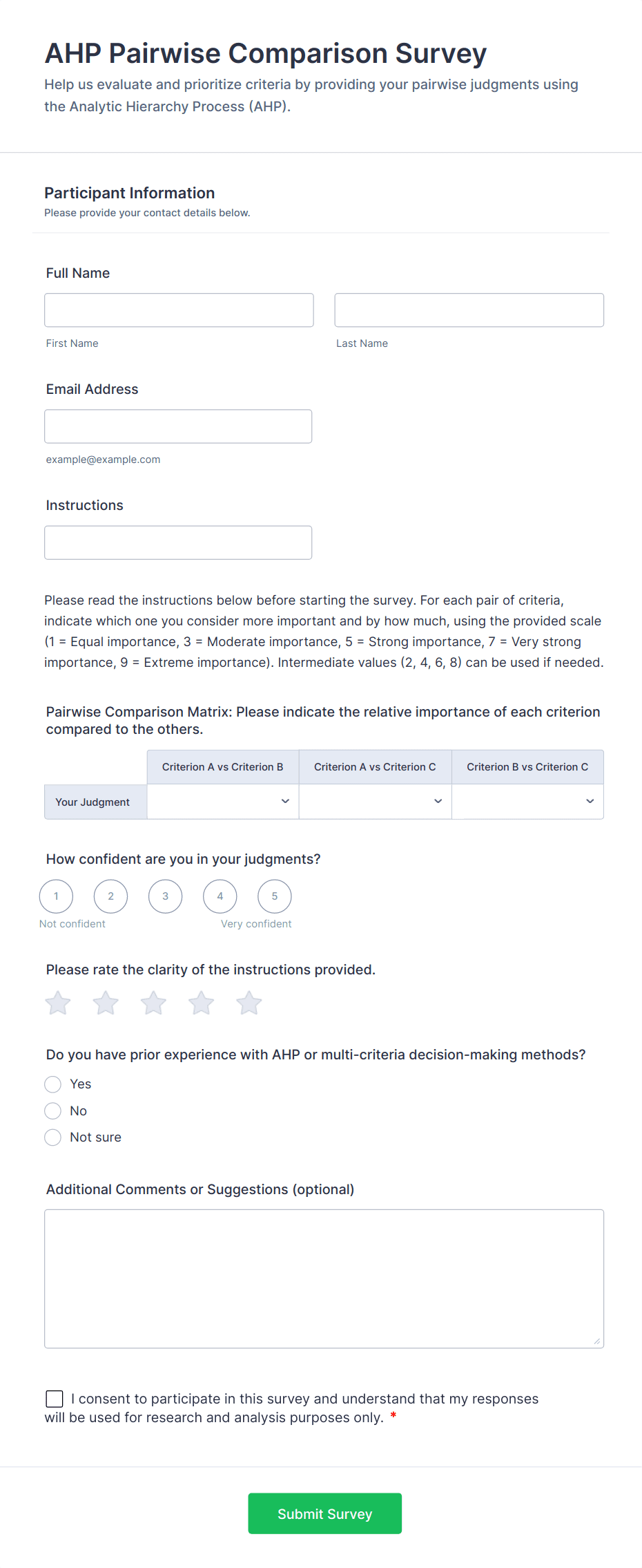 Survey templates are pre-designed forms that help individuals and organizations collect feedback, opinions, or data from a target audience. These templates are widely used for a variety of purposes, such as customer satisfaction surveys, employee engagement assessments, market research, event feedback, and academic studies. By providing a structured set of questions, survey templates streamline the process of gathering valuable insights, making it easier to analyze trends, measure satisfaction, and make informed decisions. Whether you’re a business owner, HR professional, educator, or researcher, survey templates offer a quick and effective way to reach your audience and collect actionable information.