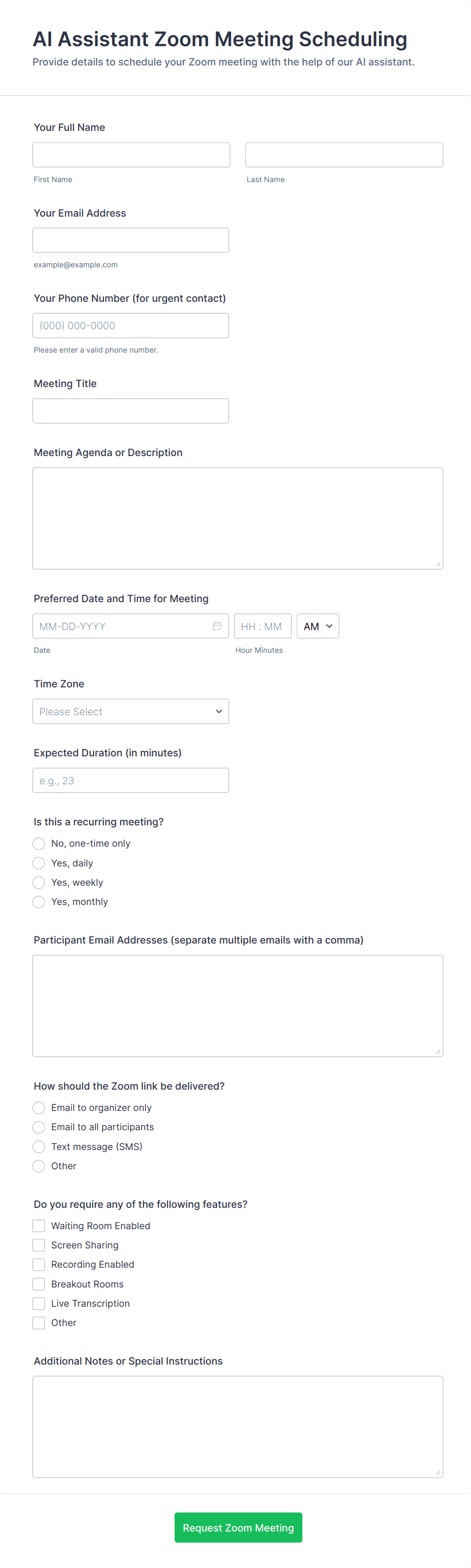 A meeting form is an online tool used to organize, schedule, and manage meetings by collecting essential information such as attendee details, agenda items, and feedback.