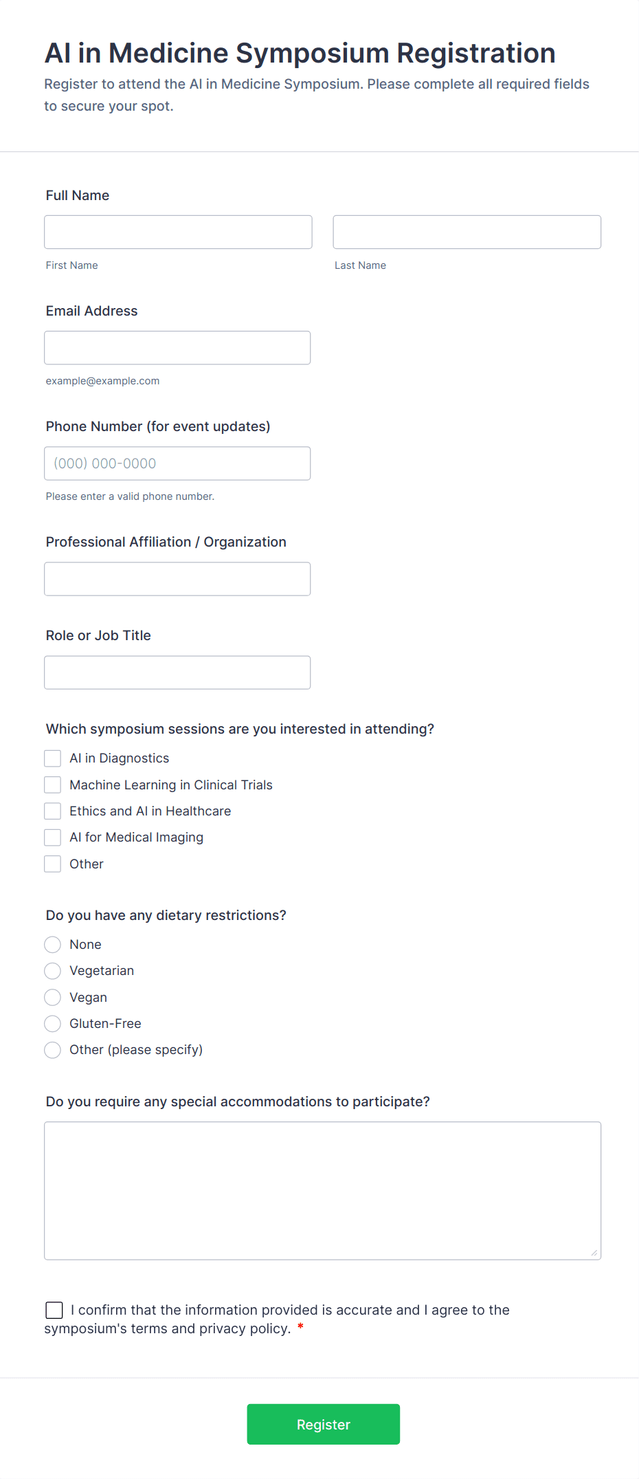 • Session or Workshop Selection (dropdowns or checkboxes)