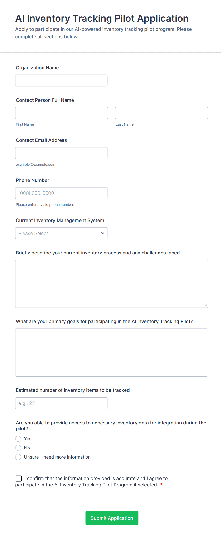 - Inventory Tracking: Forms may include fields for item name, SKU, quantity, location, and restock dates.