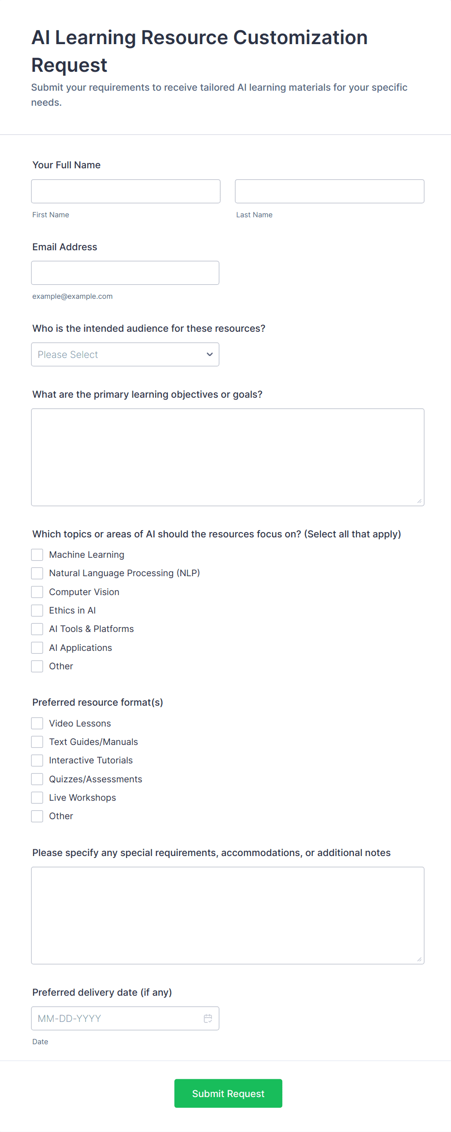 • Use conditional logic to show or hide fields based on the request type or user responses.