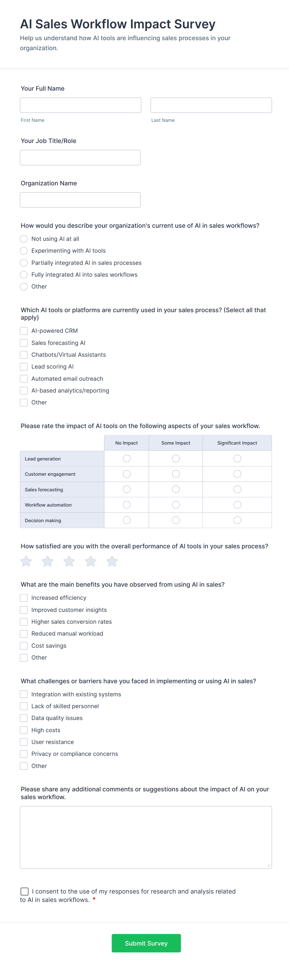 AI Agent Chat Interaction Feedback Form helps product and support teams collect user satisfaction scores and comments about AI chats, turning feedback into insights to improve AI experiences.