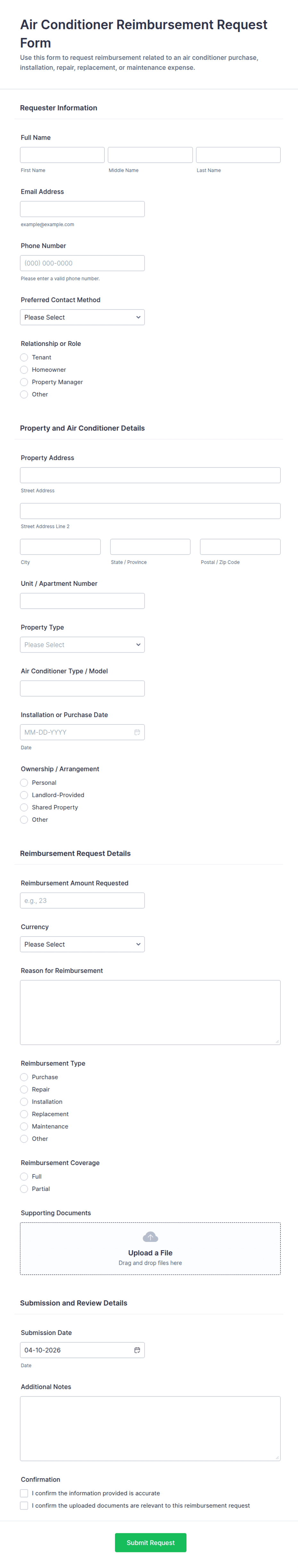Expense Reimbursement Intake Form Templates are specialized digital forms designed to streamline the process of collecting, reviewing, and approving employee expense claims. These templates are commonly used by businesses, non-profits, educational institutions, and other organizations to gather detailed information about expenses incurred by staff, such as travel, meals, office supplies, or client entertainment. By standardizing the intake process, these forms help ensure that all necessary documentation—like receipts, dates, and expense categories—is captured efficiently, reducing errors and speeding up reimbursement cycles. Use cases range from simple one-off expense claims to ongoing monthly submissions, departmental expense tracking, and even project-based reimbursements.