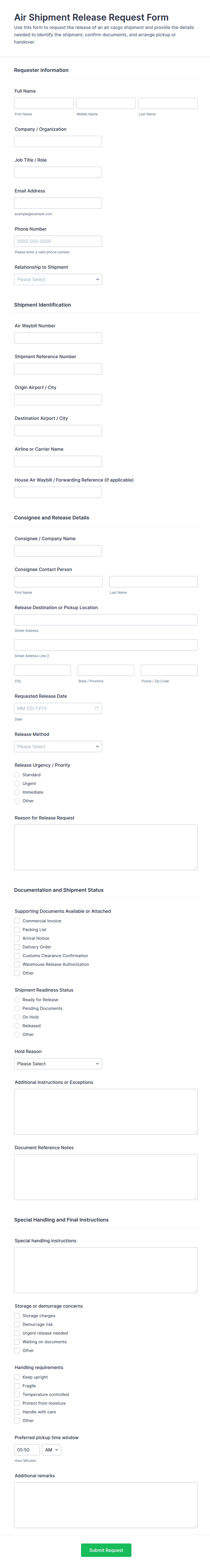 Transportation Request Forms are digital documents designed to streamline the process of requesting, scheduling, and managing transportation services. These forms are commonly used by organizations, schools, event planners, logistics companies, and individuals to coordinate vehicle usage, arrange pickups and drop-offs, or request special transport accommodations. Typical use cases include employee shuttle requests, student field trip transportation, medical transport scheduling, delivery service coordination, and event guest transfers. By centralizing transportation requests, these forms help ensure that all necessary details—such as passenger information, pickup and drop-off locations, dates, times, and special requirements—are accurately captured and communicated.