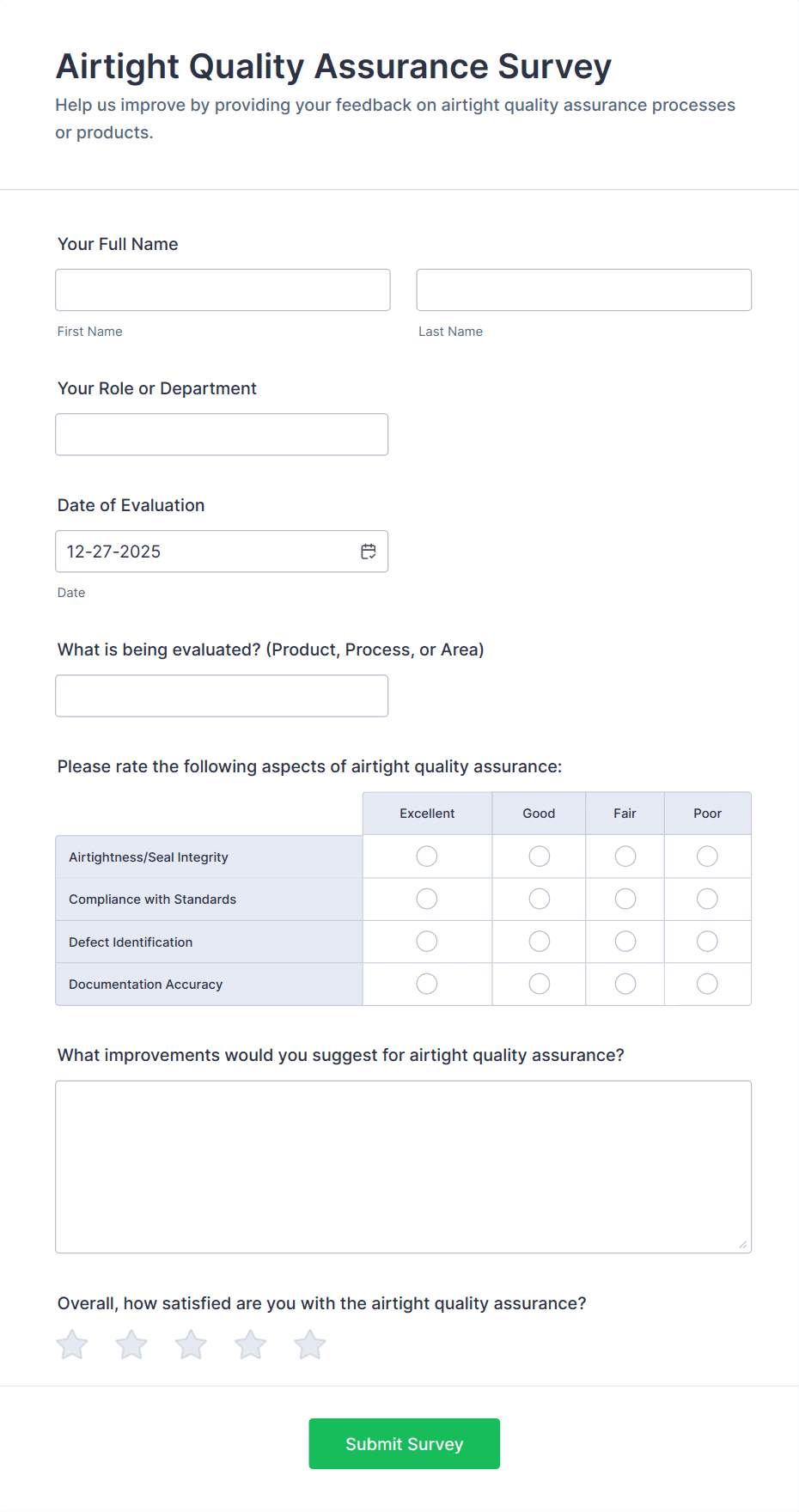 Quality surveys are specialized tools designed to gather feedback, measure satisfaction, and assess the effectiveness of products, services, or processes. Organizations across industries use quality surveys to monitor customer experiences, evaluate employee performance, ensure compliance with standards, and identify areas for improvement. These surveys can be tailored for various scenarios, such as product quality assessments, service delivery evaluations, internal audits, and post-project reviews. By systematically collecting and analyzing responses, businesses and institutions can make data-driven decisions to enhance their offerings and maintain high standards.