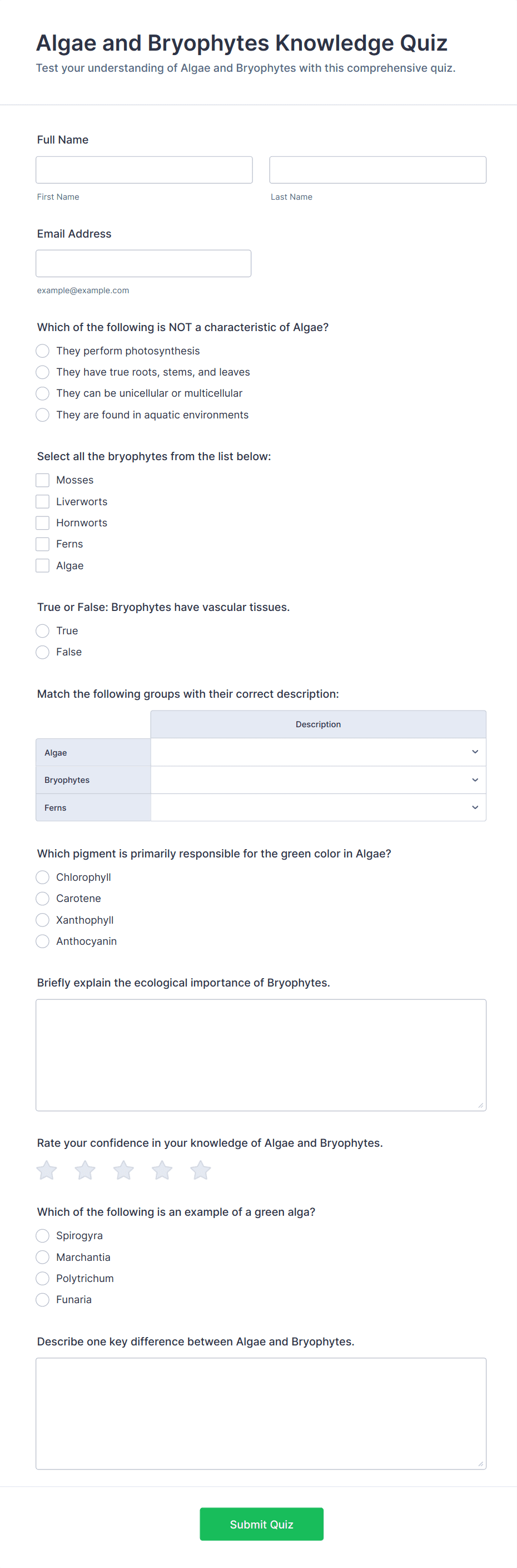 Quiz Templates are pre-designed forms specifically created to facilitate the process of building quizzes for a variety of purposes, such as education, employee training, lead generation, event engagement, and more. These templates provide a structured way to present questions, collect answers, and automatically score or evaluate responses. Whether you’re a teacher assessing student knowledge, a business running a product knowledge test, or a marketer creating a fun personality quiz, Quiz Templates offer a flexible foundation to suit your needs. They can be used for online exams, trivia games, onboarding assessments, customer feedback quizzes, and interactive learning modules.