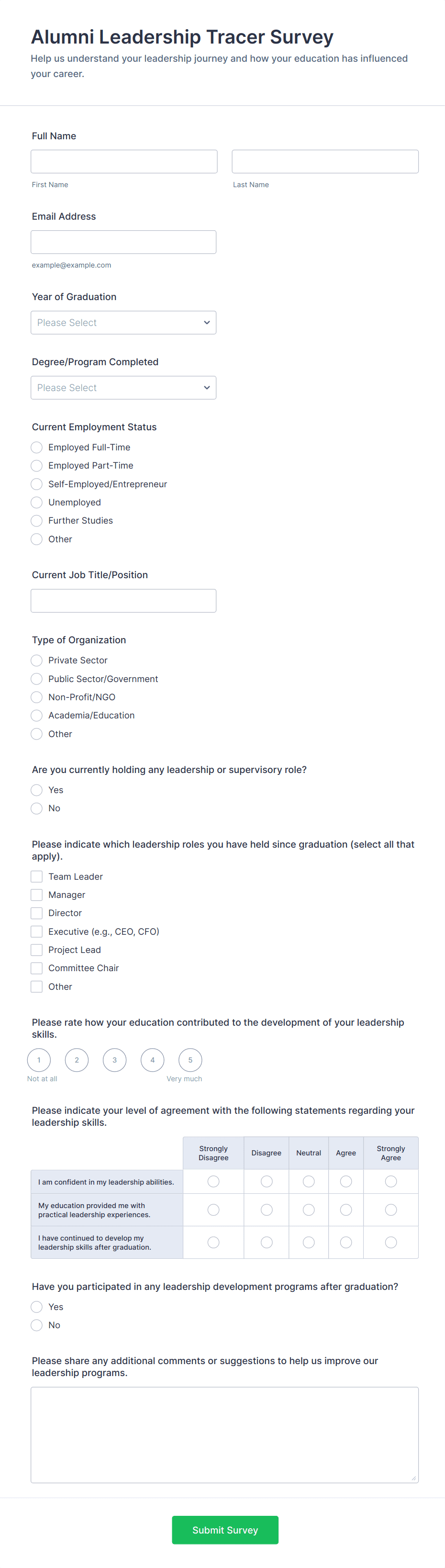 An Alumni Questionnaire is a form template designed to streamline your alumni engagement efforts. This template allows universities and colleges to effectively gather valuable insights about alumni experiences and their current status.