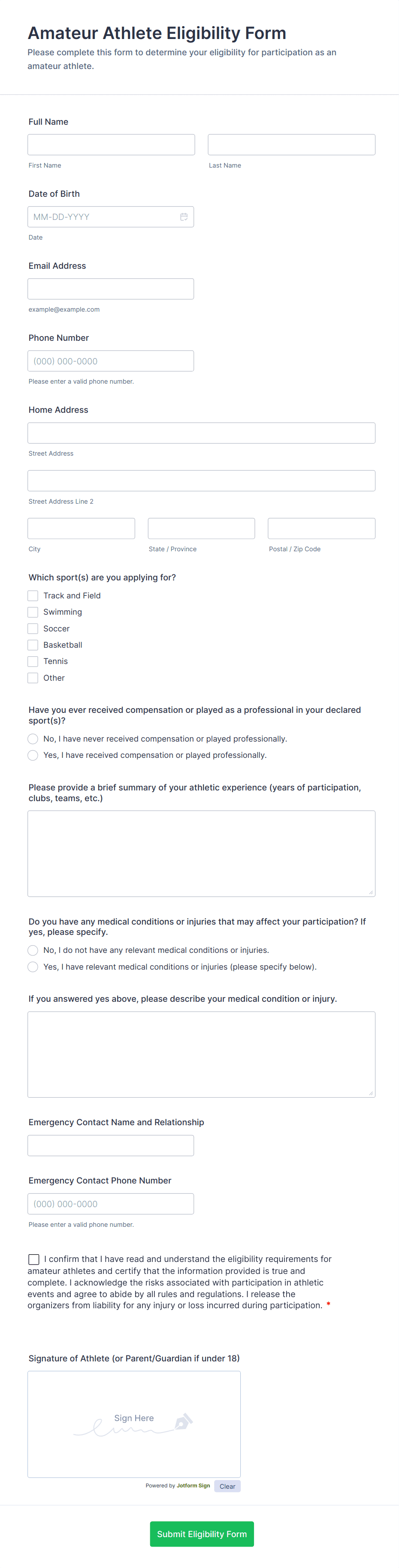 Want to spend more time on the field and less time organizing your team’s information? Easily collect your sports team’s registrations, scholarship applications, or performance evaluations with free Athlete Forms from Jotform. Choose one of our many templates and start customizing with our easy to use no-code drag-and-drop builder. Upload your team’s logo, choose fonts and colors, and integrate your form with 100+ third-party platforms in just a few easy clicks. Share your form to your team directly or embed it in your website in seconds. Up your form game with powerful Athlete Forms from Jotform.