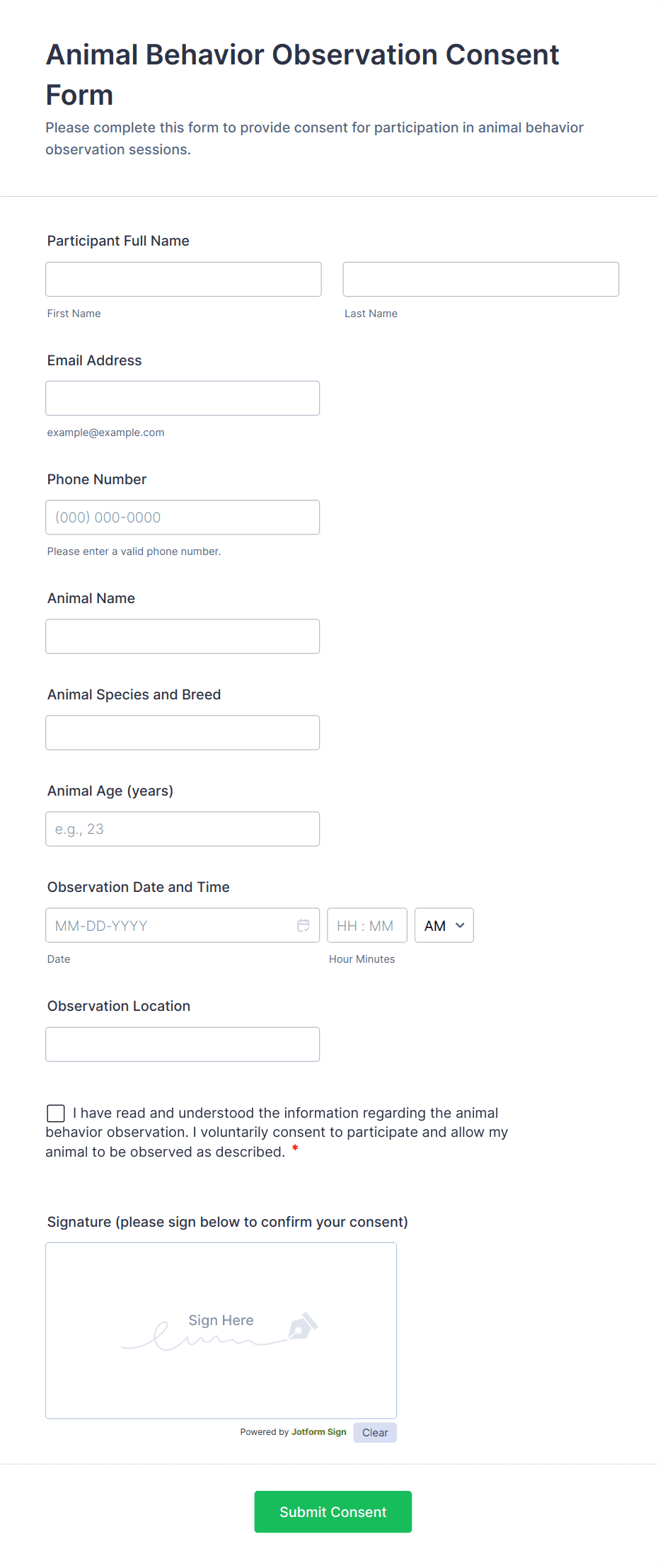 By following these steps, you can create informed consent forms that are comprehensive, user-friendly, and compliant with industry standards. Jotform’s flexible tools make it easy to adapt your form to any scenario, ensuring you collect the necessary permissions and protect both your organization and your participants.