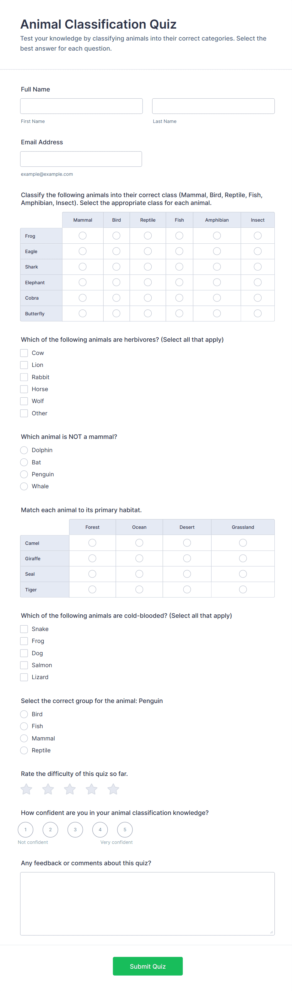 Quiz Templates are pre-designed forms specifically created to facilitate the process of building quizzes for a variety of purposes, such as education, employee training, lead generation, event engagement, and more. These templates provide a structured way to present questions, collect answers, and automatically score or evaluate responses. Whether you’re a teacher assessing student knowledge, a business running a product knowledge test, or a marketer creating a fun personality quiz, Quiz Templates offer a flexible foundation to suit your needs. They can be used for online exams, trivia games, onboarding assessments, customer feedback quizzes, and interactive learning modules.