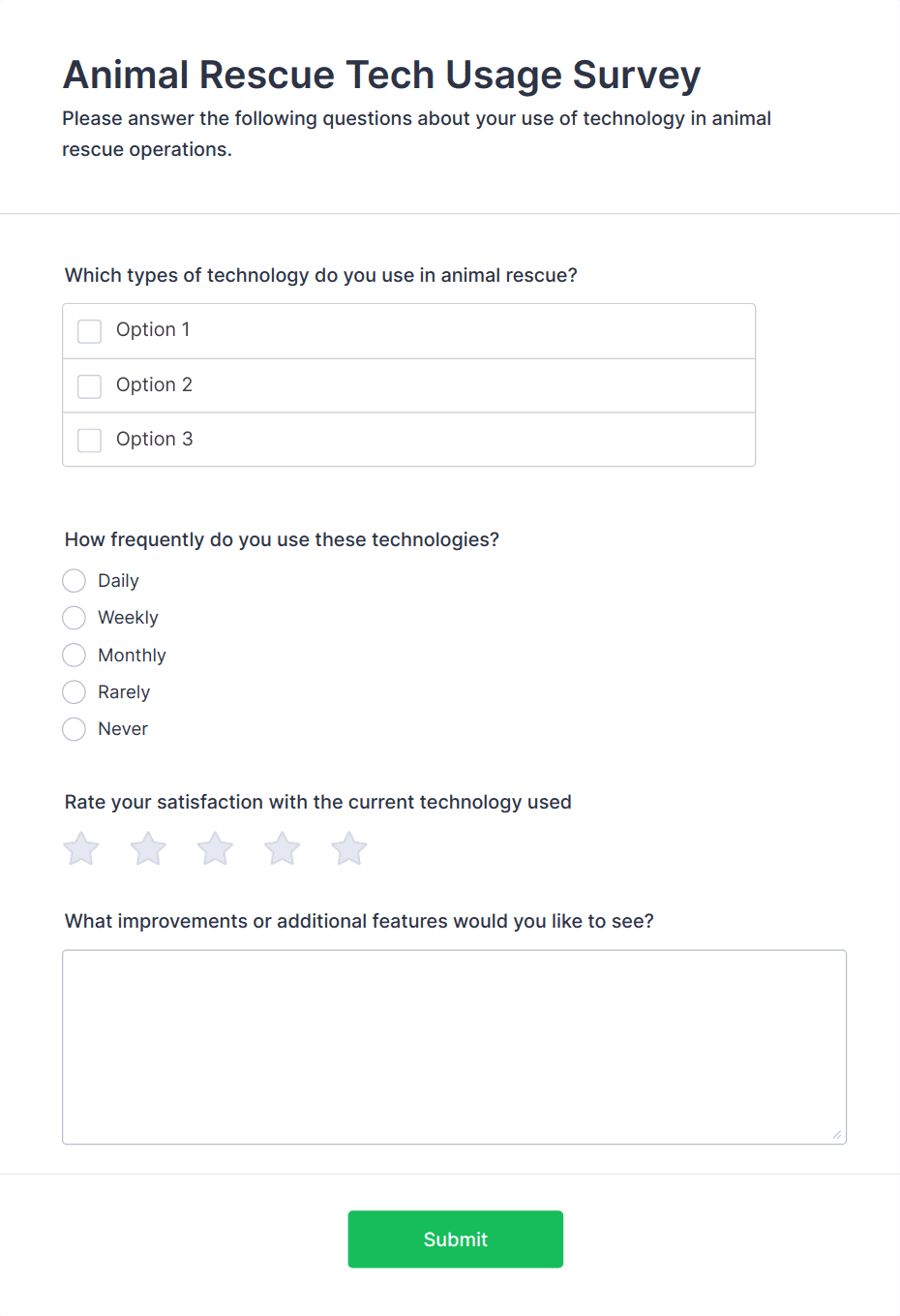 • Adoption Applications: Collect detailed information from potential adopters, including household details, pet experience, and preferences, to ensure a good match between animals and families.