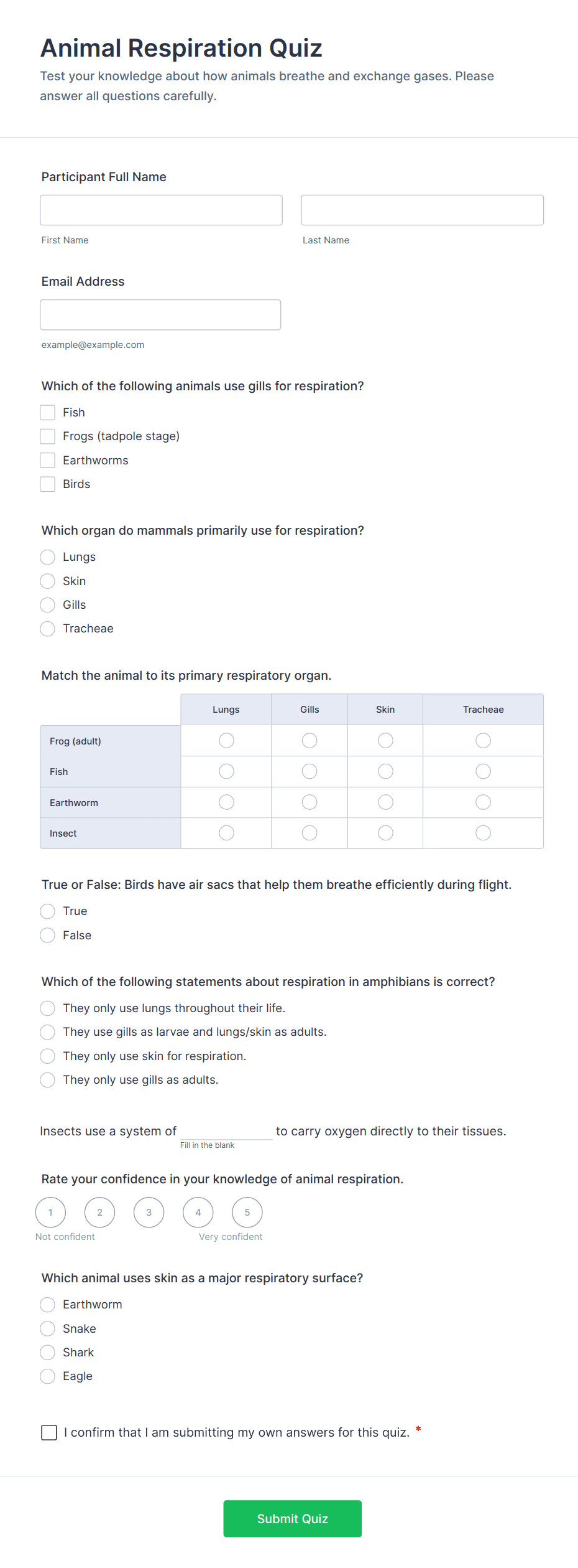 Quiz Templates are pre-designed forms specifically created to facilitate the process of building quizzes for a variety of purposes, such as education, employee training, lead generation, event engagement, and more. These templates provide a structured way to present questions, collect answers, and automatically score or evaluate responses. Whether you’re a teacher assessing student knowledge, a business running a product knowledge test, or a marketer creating a fun personality quiz, Quiz Templates offer a flexible foundation to suit your needs. They can be used for online exams, trivia games, onboarding assessments, customer feedback quizzes, and interactive learning modules.