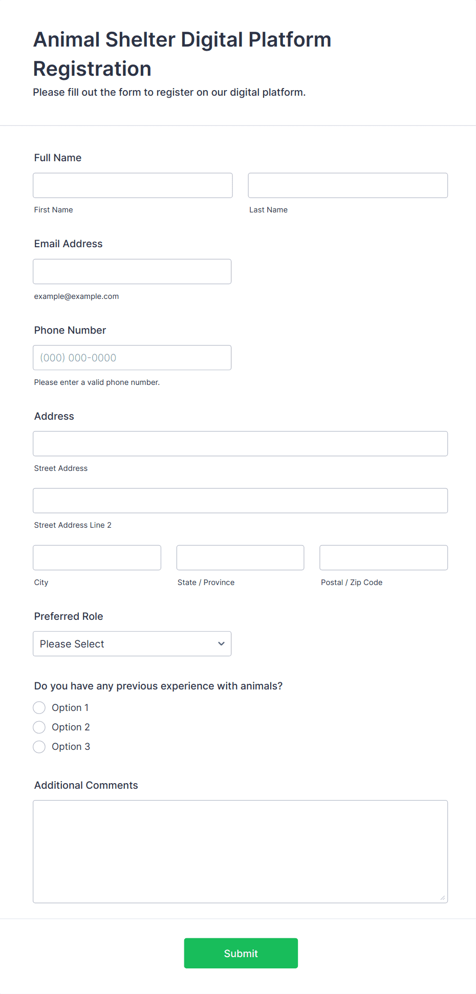 These forms streamline data collection, reduce paperwork, and ensure that shelters have accurate, organized records for adoptions, volunteers, donations, and animal care.