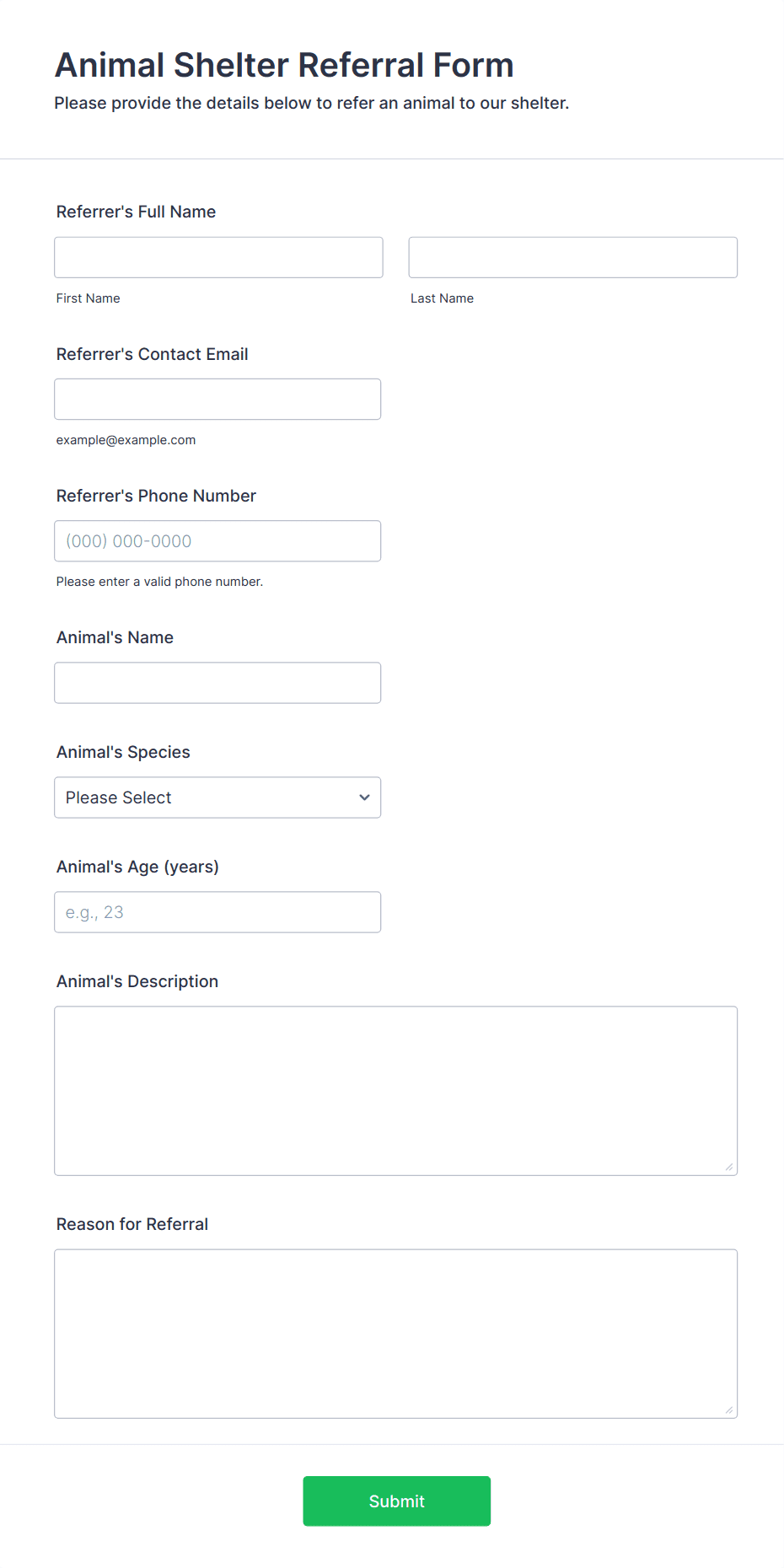 An animal shelter form template is a pre-designed online form that helps animal shelters and rescue organizations collect and manage information for processes like adoptions, volunteering, donations, and animal intake.