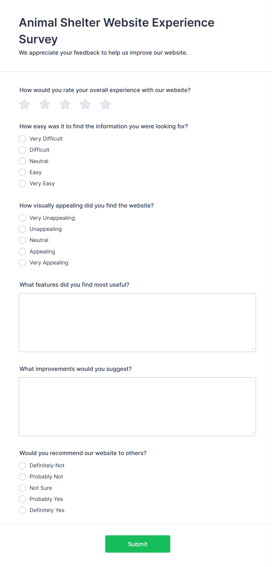 An animal shelter form template is a pre-designed online form that helps animal shelters and rescue organizations collect and manage information for processes like adoptions, volunteering, donations, and animal intake.