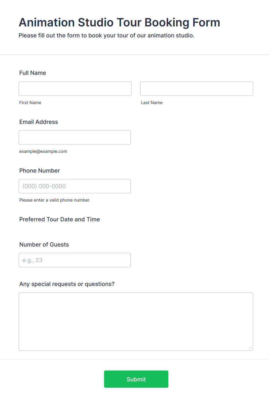 - Real Estate Tours: May require fields for property address, preferred time slots, and agent selection.