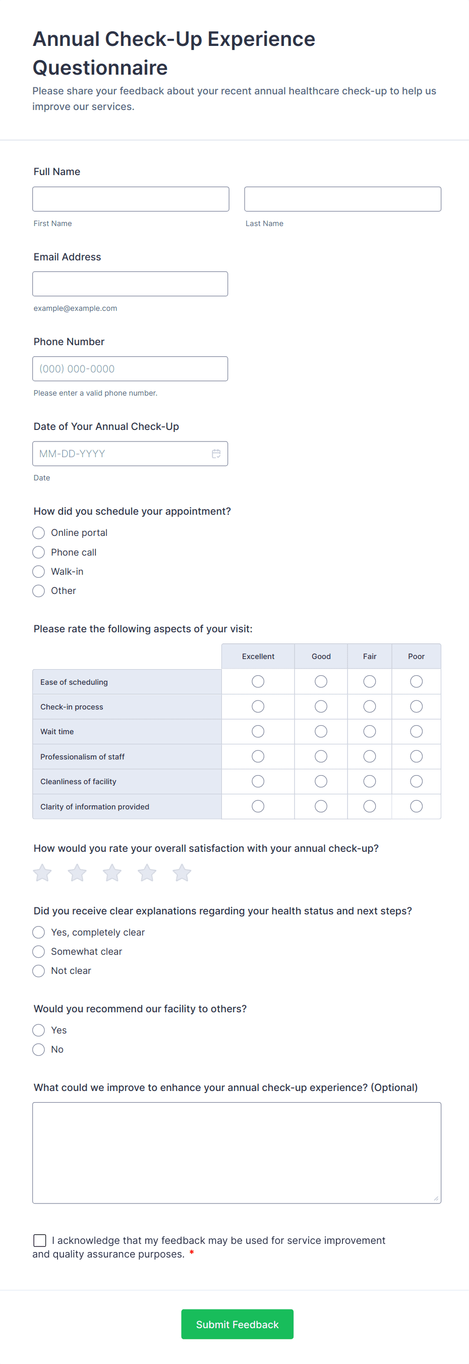 • Determine the purpose of your feedback form (e.g., post-visit satisfaction, telemedicine experience, department-specific feedback).