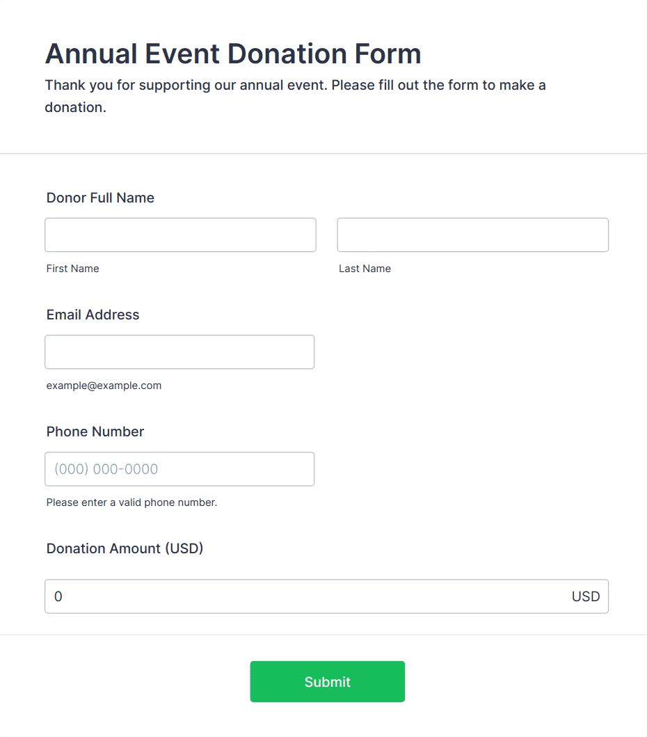 Donation forms are specialized online forms designed to collect contributions for charitable organizations, fundraising campaigns, nonprofit initiatives, and community projects. These forms streamline the process of gathering donor information, processing payments, and tracking contributions, making it easier for organizations to raise funds efficiently. Donation forms can be used for a variety of purposes, such as one-time or recurring donations, event sponsorships, crowdfunding efforts, membership drives, and emergency relief campaigns. They are essential tools for nonprofits, schools, religious groups, and community organizations seeking to engage supporters and facilitate secure, convenient giving.