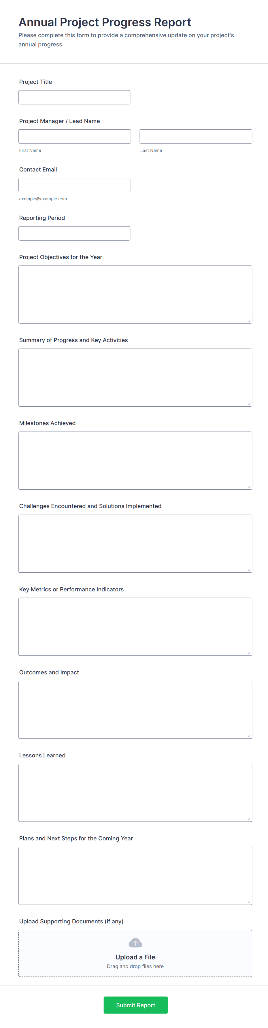• Financial Reports: Require fields for numerical data, dates, and categories.