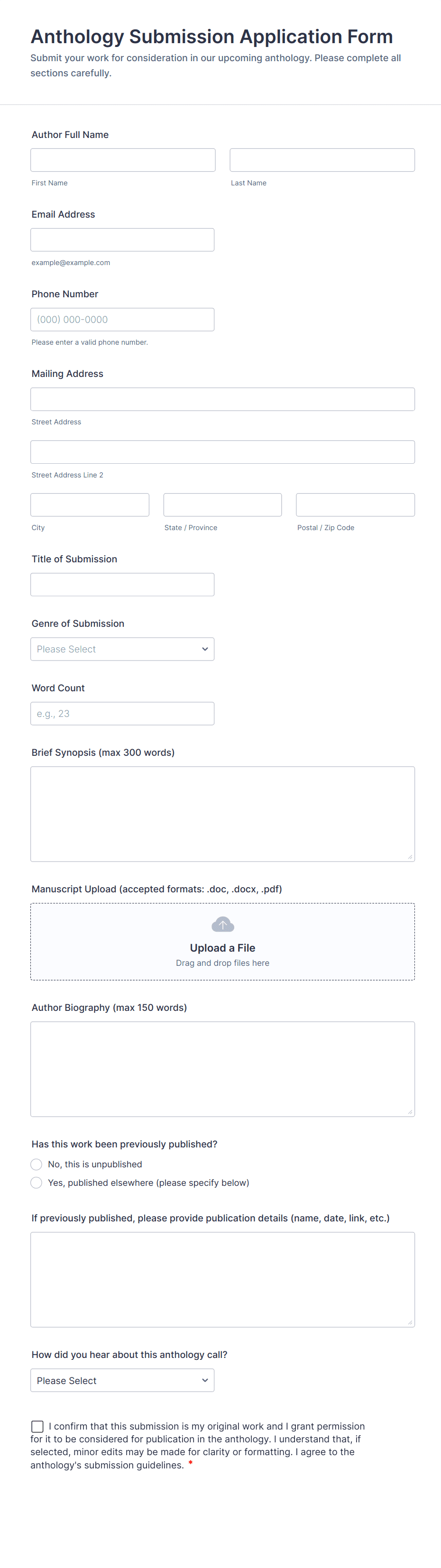 Content Forms are specialized online forms designed to facilitate the collection, submission, and management of various types of content. These forms are commonly used for gathering articles, blog posts, creative writing, multimedia files, user-generated content, feedback, and editorial submissions. Organizations, publishers, marketing teams, and educators often rely on Content Forms to streamline the process of receiving and organizing content from contributors, freelancers, or the public. Whether you’re running a magazine, managing a content marketing campaign, or collecting student assignments, Content Forms help ensure that submissions are structured, complete, and easy to review.