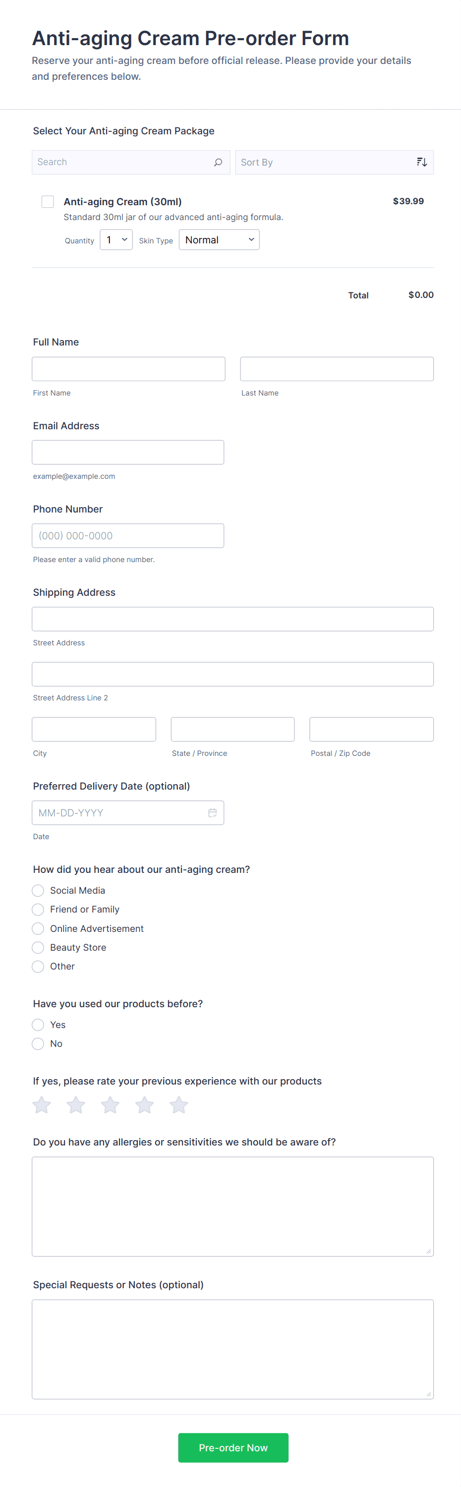 Preorder forms are specialized online forms designed to collect advance orders for products or services before they are officially released or available for general sale. Businesses, creators, and organizations use preorder forms to gauge demand, secure early sales, and streamline inventory planning for upcoming launches. These forms are commonly used for new product releases, limited-edition items, event tickets, seasonal goods, or even digital content. By allowing customers to reserve or purchase items ahead of time, preorder forms help businesses manage expectations, reduce the risk of overproduction, and build excitement around new offerings.