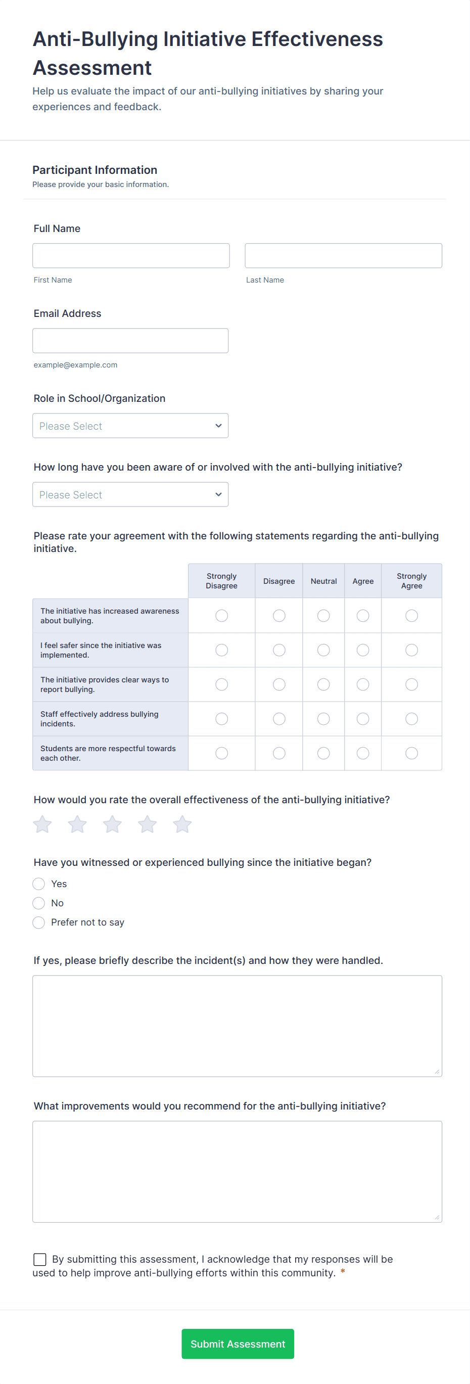 • For teacher or staff surveys: Include self-assessment fields, peer review sections, and narrative response options.