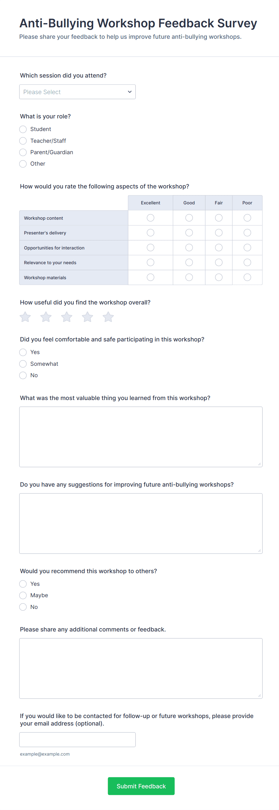 • Trainer Evaluation: Gather feedback on the effectiveness, communication skills, and engagement level of trainers or facilitators.