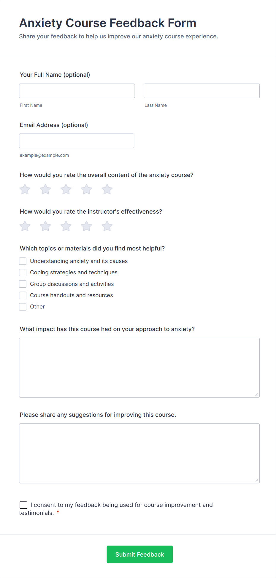 A feedback form that can be used to get testimonial at the end of a block of sessions.