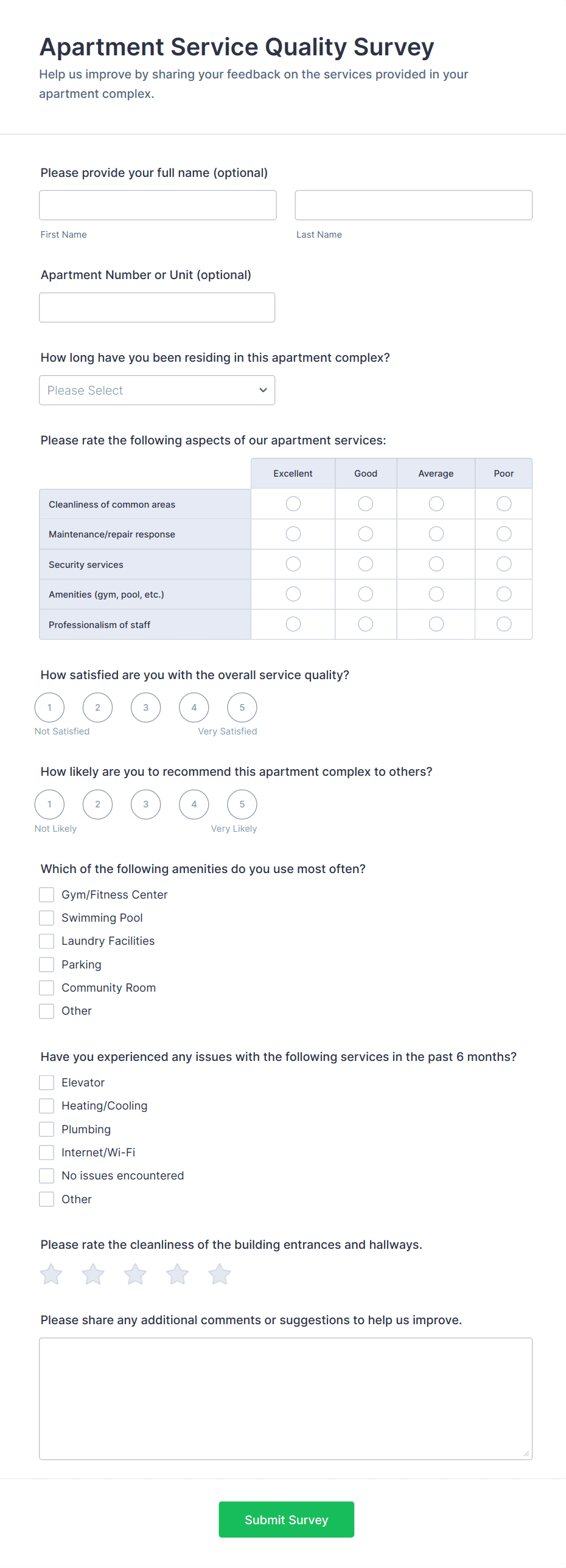 A property management survey is a customer feedback survey that allows residents to rate any apartment complex they live in.