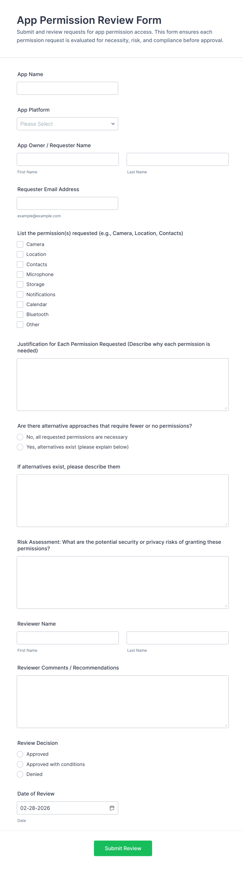Access control forms are structured documents used to request, approve, and document access to physical locations, systems, or restricted resources. They help organizations manage who can enter certain areas, use specific equipment, or access sensitive digital systems by collecting consistent details such as requester identity, access level, justification, and approval records. Access control forms are commonly used in offices, campuses, data centers, hospitals, warehouses, and IT environments for badge requests, visitor access, temporary passes, role-based system access, and permission changes. By standardizing access requests, these forms reduce security risks, improve accountability, and create clear audit trails.