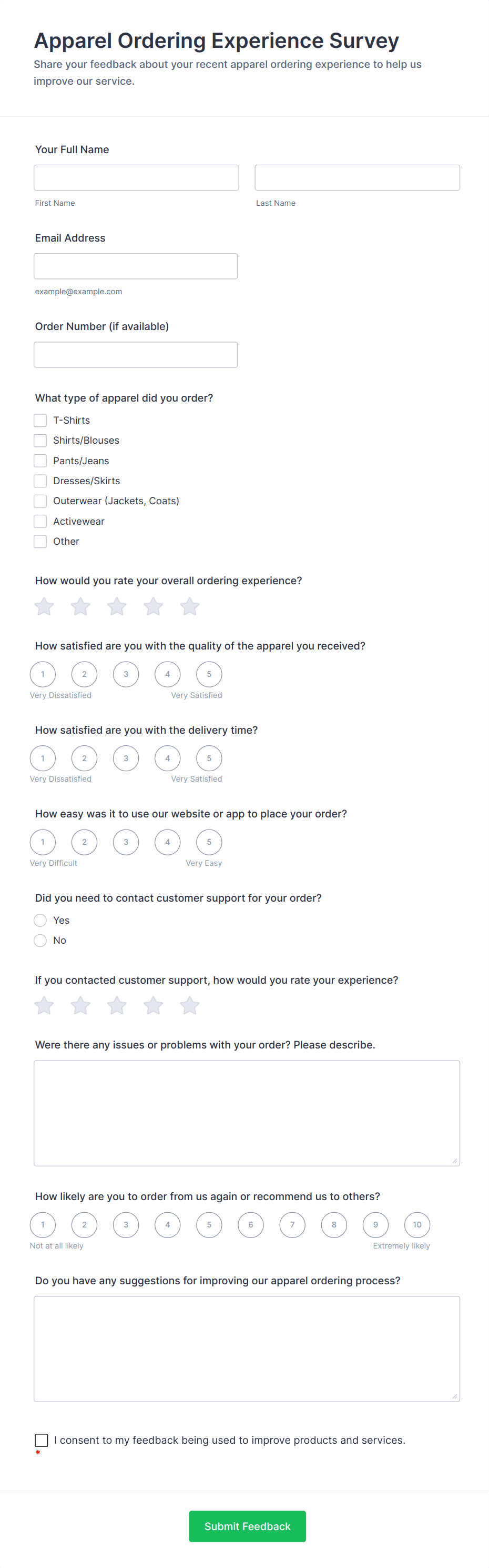- Multiple choice and rating scales for satisfaction or feature evaluation.