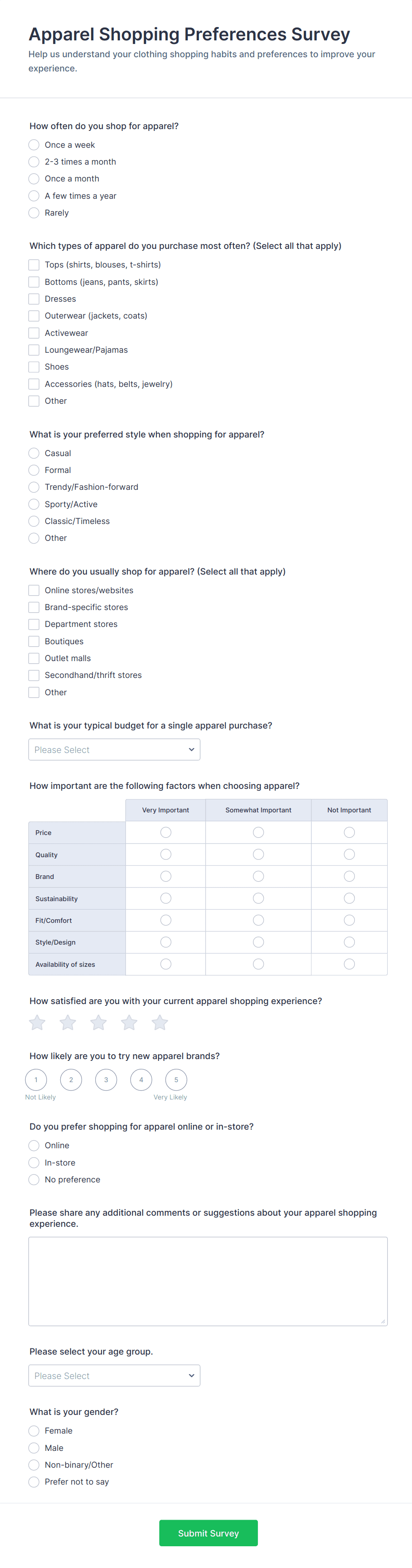 • Multiple choice and rating scales for satisfaction or feature evaluation.