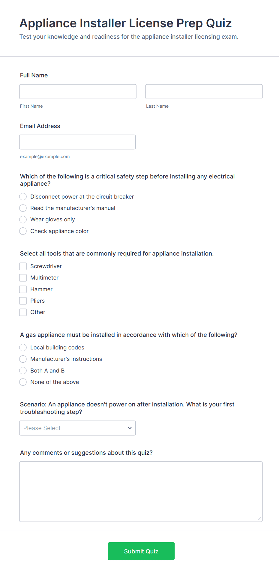 Quiz Templates are pre-designed forms specifically created to facilitate the process of building quizzes for a variety of purposes, such as education, employee training, lead generation, event engagement, and more. These templates provide a structured way to present questions, collect answers, and automatically score or evaluate responses. Whether you’re a teacher assessing student knowledge, a business running a product knowledge test, or a marketer creating a fun personality quiz, Quiz Templates offer a flexible foundation to suit your needs. They can be used for online exams, trivia games, onboarding assessments, customer feedback quizzes, and interactive learning modules.
