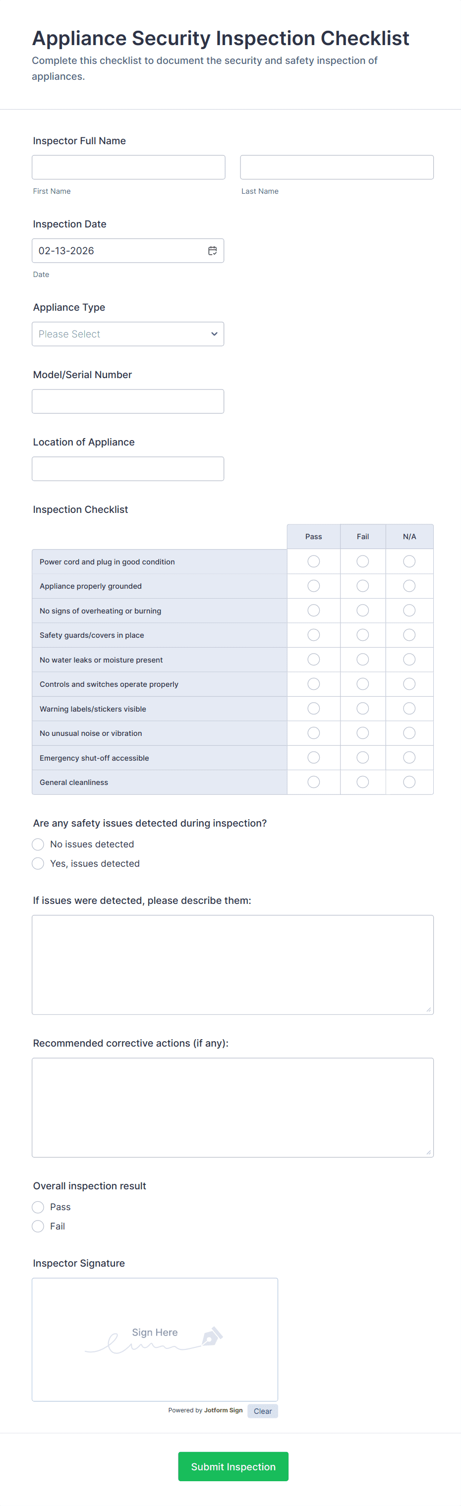 • Connect your form to Jotform Tables for automatic data storage and easy tracking of inspection results.