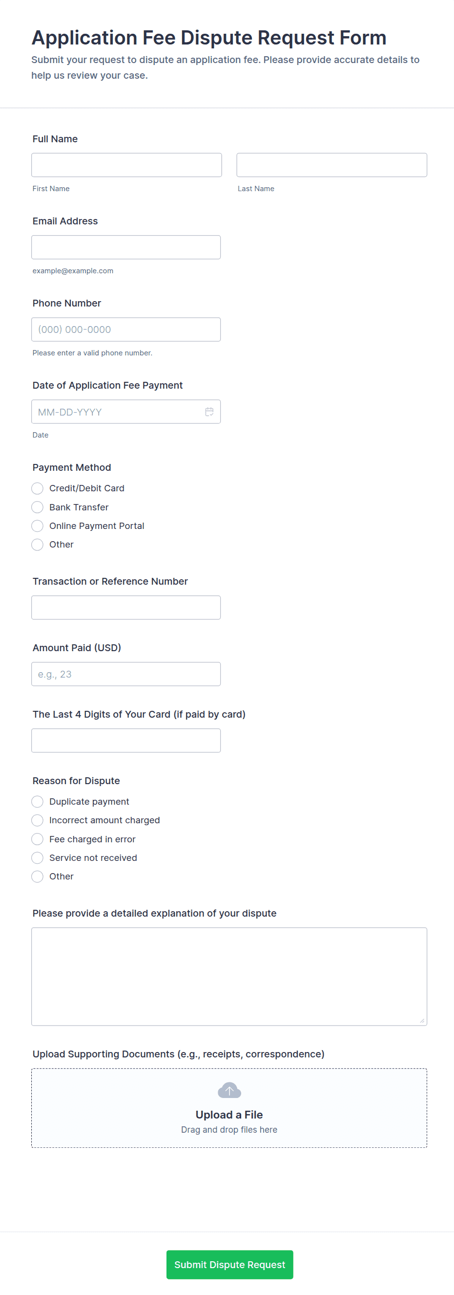 - Use conditional logic to show or hide fields based on user responses (e.g., only display “Supporting Documents” if a certain adjustment type is selected).