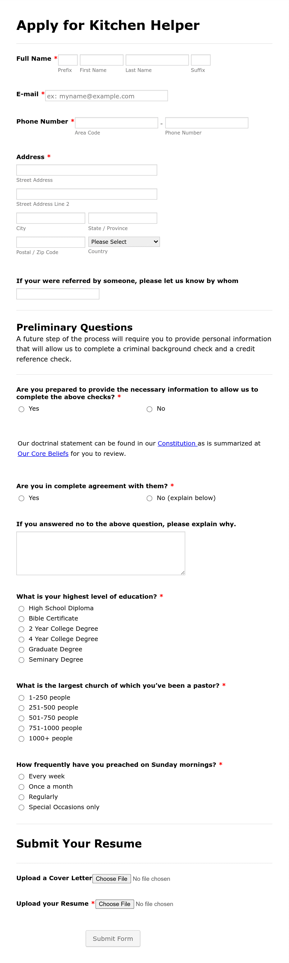 • For job applications, include fields for personal information, education, work experience, references, and file uploads for resumes or cover letters.
