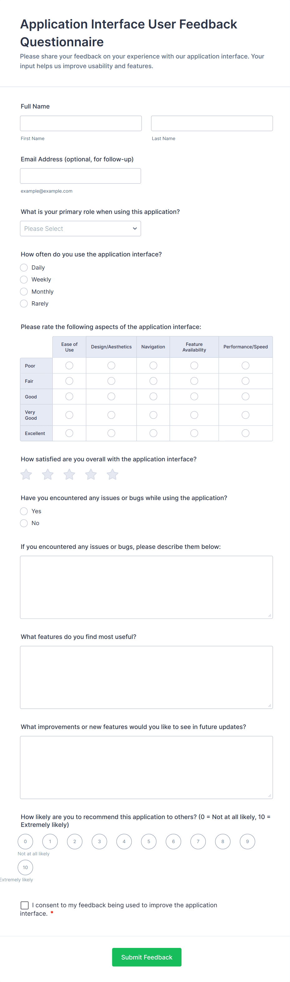 - For customer feedback, include satisfaction ratings and open-ended comment fields.