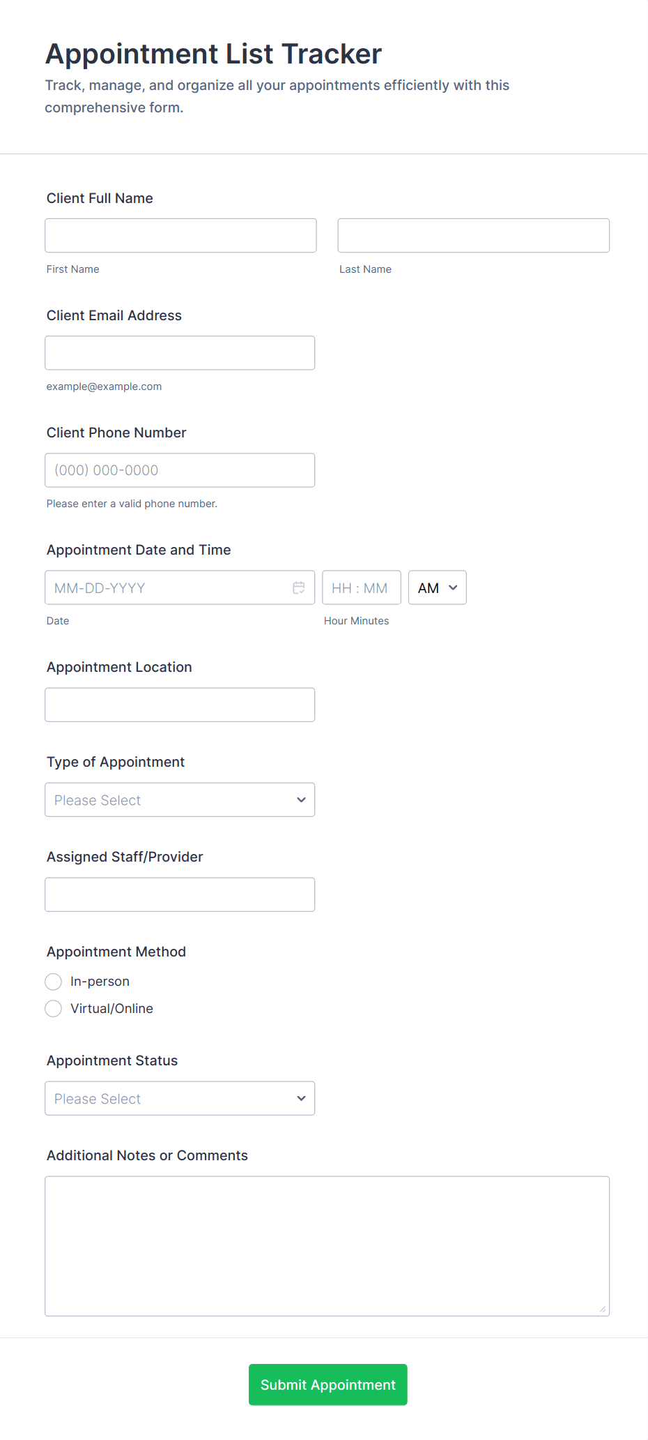 Appointment forms help businesses manage their schedules efficiently, reduce double-bookings, minimize no-shows, and provide a professional, organized experience for clients.