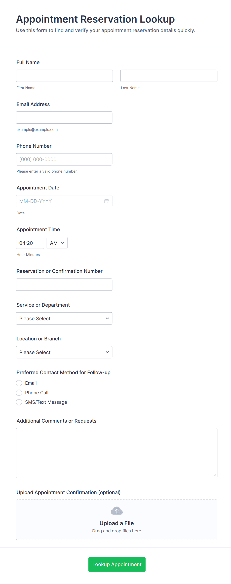Appointment forms are digital tools designed to streamline the process of scheduling meetings, consultations, interviews, or any type of appointment between service providers and clients. These forms are commonly used by healthcare professionals, salons, educational institutions, consultants, and businesses that require organized time management for their services. By collecting essential information such as preferred dates, times, contact details, and specific service requests, appointment forms help reduce scheduling conflicts, minimize no-shows, and improve overall efficiency. Whether you’re managing a busy clinic, coordinating interviews, or booking personal training sessions, appointment forms provide a structured way to handle bookings and keep your calendar organized.