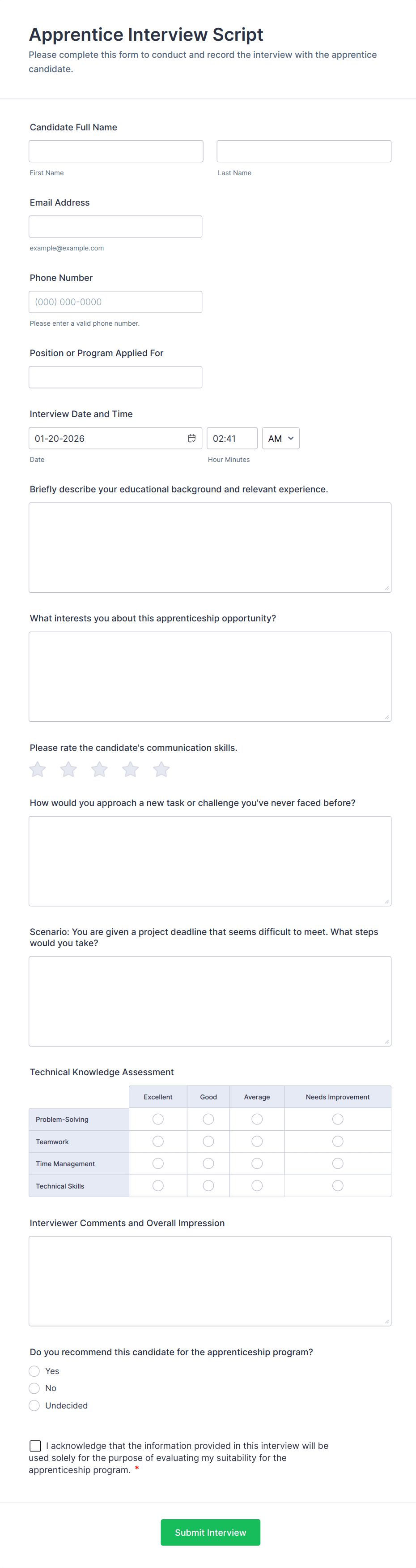 An interview form is a structured document or digital tool used to collect information from individuals during interviews. It standardizes the questions and response formats, ensuring consistency and efficiency in data collection.
