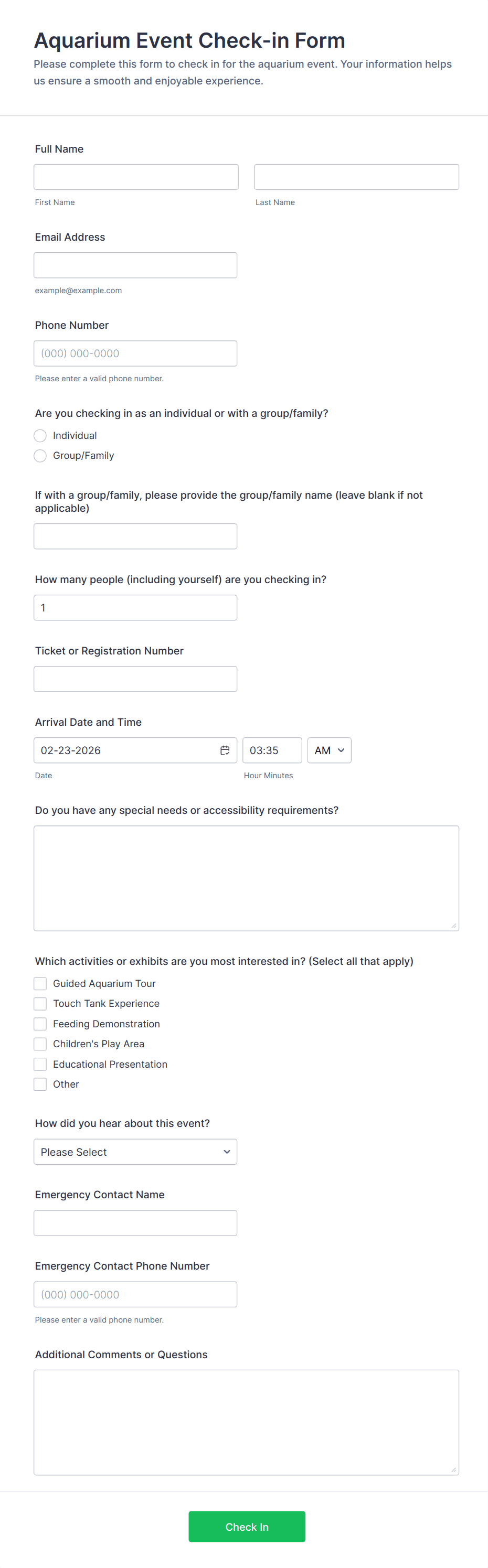 - Basic Fields: Name, email, phone number, date and time of check-in.