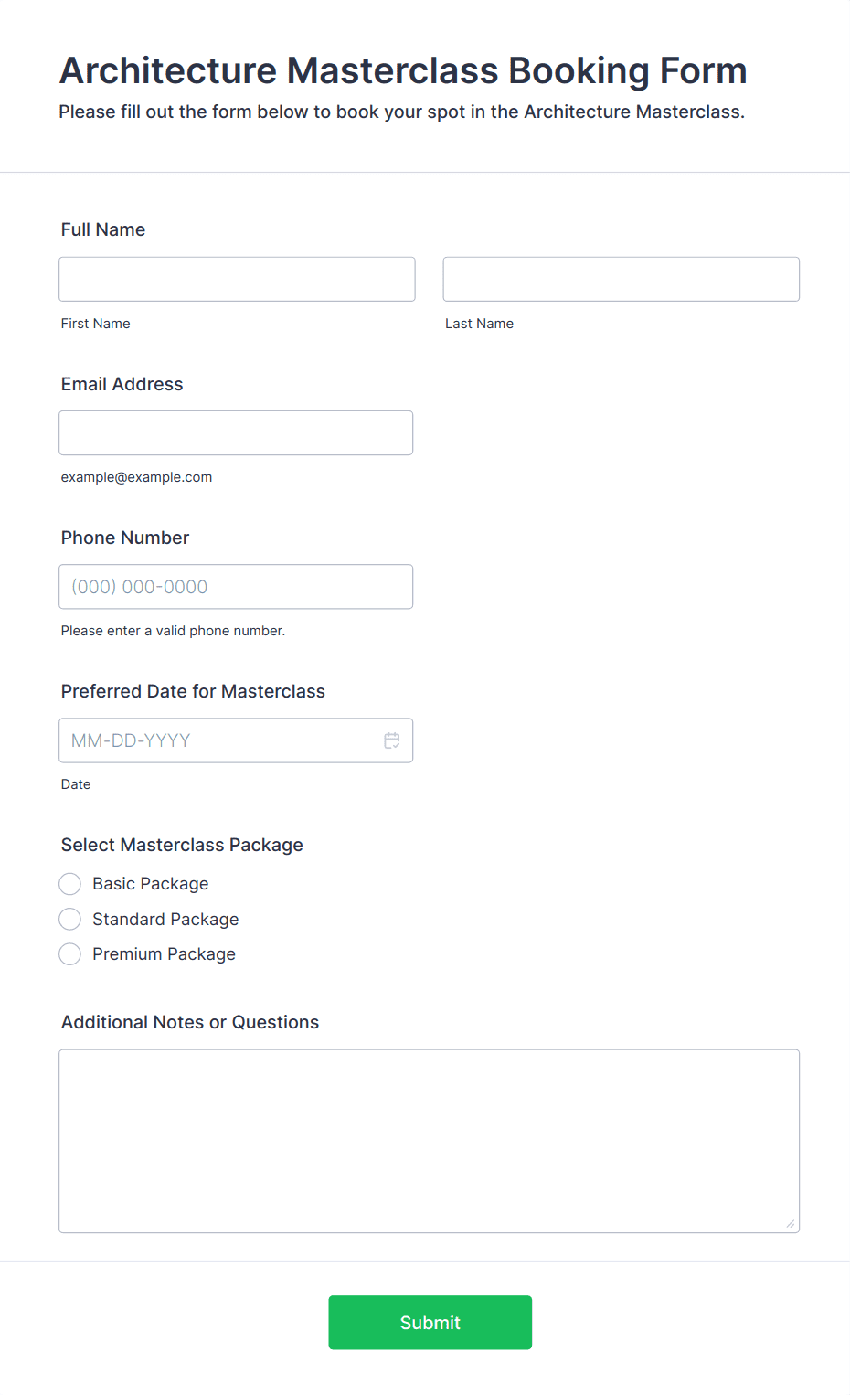Event Registration Forms are digital tools designed to streamline the process of collecting attendee information for a wide variety of events, such as conferences, workshops, webinars, fundraisers, classes, and social gatherings. These forms allow organizers to gather essential details like participant names, contact information, payment preferences, dietary restrictions, and session selections. By using event registration forms, event planners can efficiently manage RSVPs, track attendance, and ensure a smooth check-in process on the day of the event. The flexibility of these forms makes them suitable for both small private gatherings and large-scale public events, adapting to the unique requirements of each occasion.